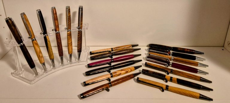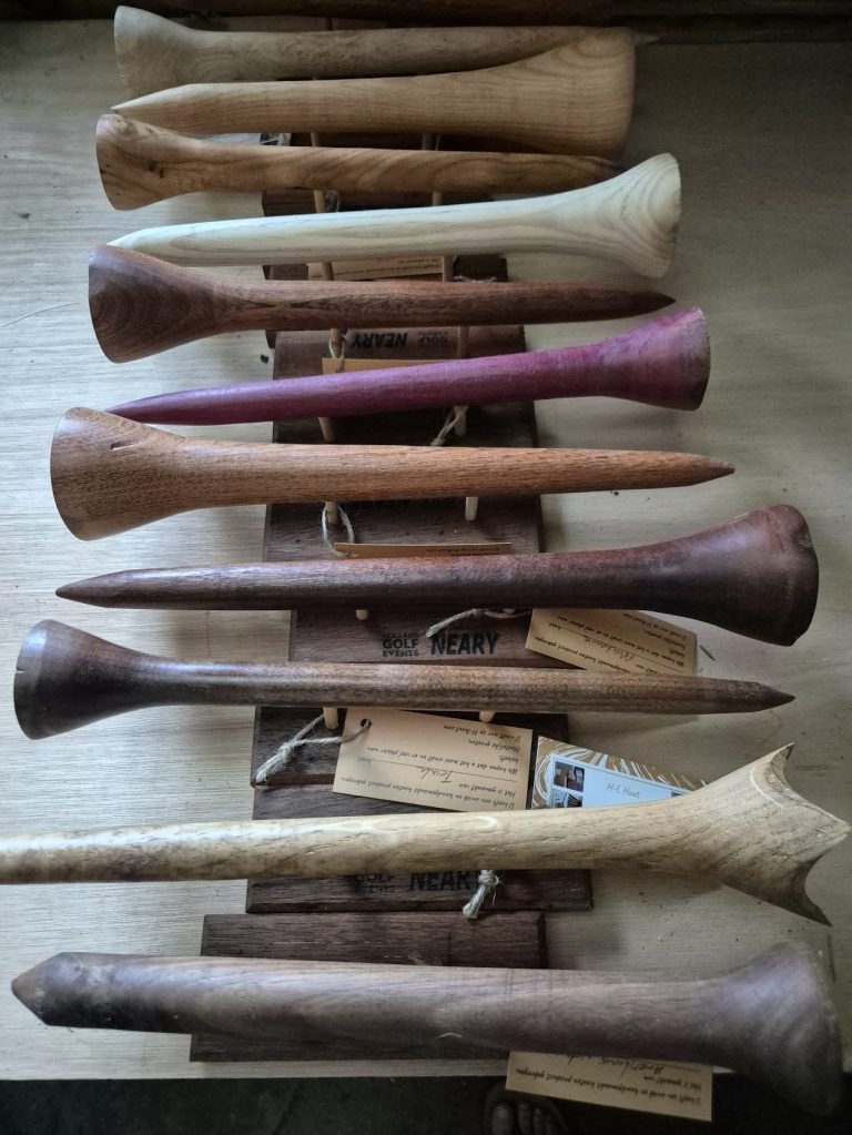Heel veel golfpennen van verschillende houtsoorten in opdracht.